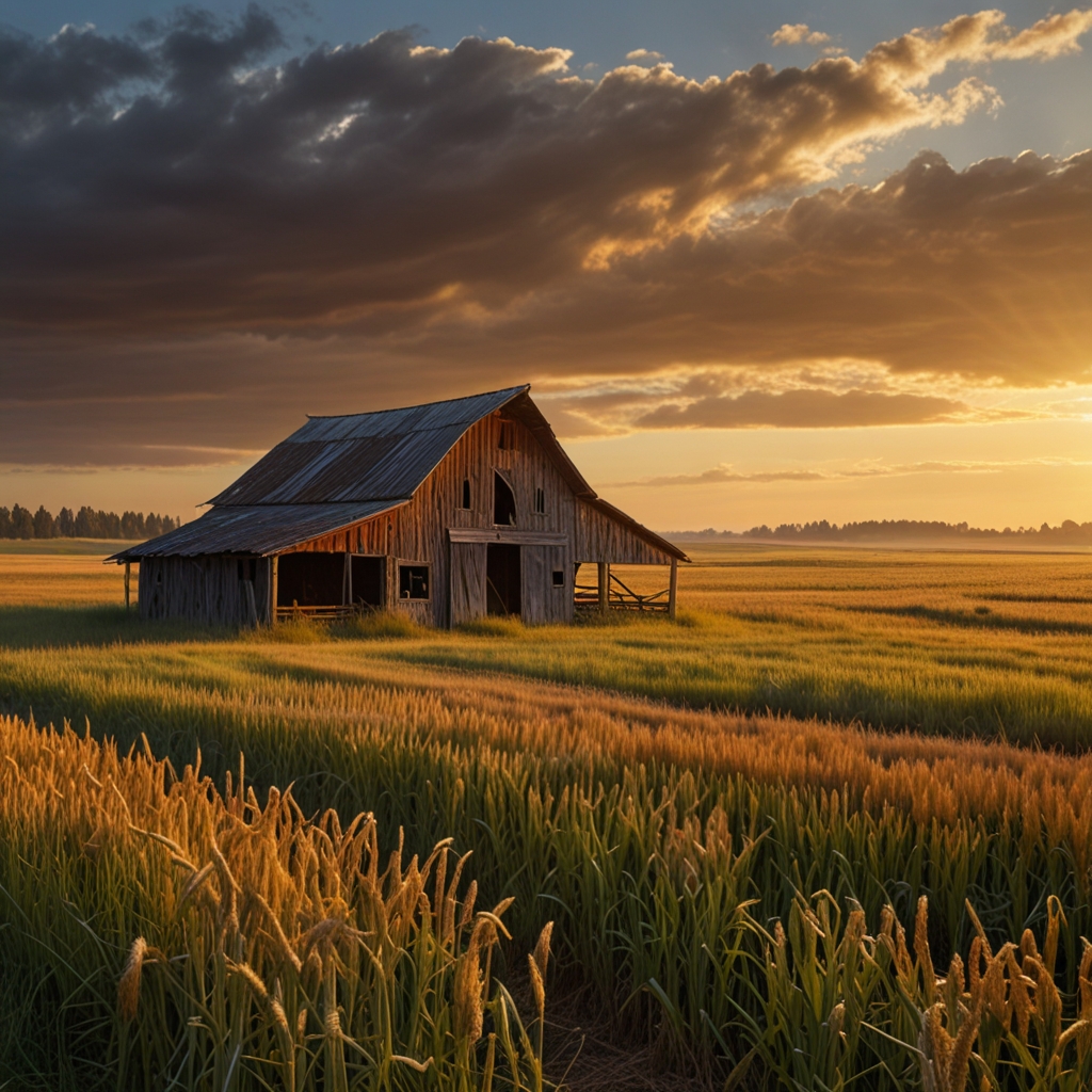 Image/Rustic, rural landscape with a old, abandoned barn and golden wheat fields at sunrise/Leonardo AI
