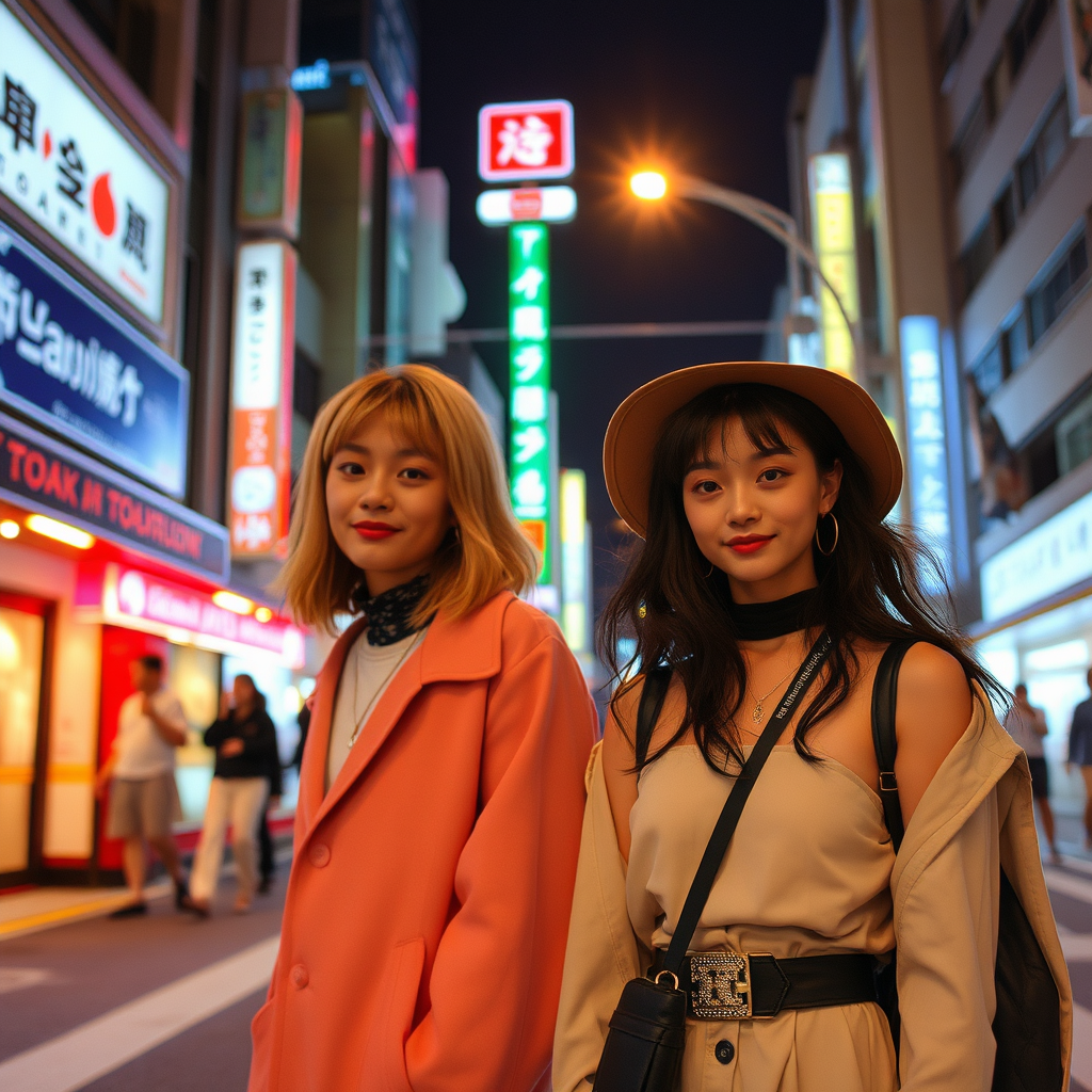 โVibrant Tokyo-night atmosphere with strong neon signage and two styled subjects gives an immediate street-fashion vibe. Colors and lighting are attractive, though the image has a slightly synthetic, overly smooth โAI commercialโ look and minor inconsistencies in accessories/edges. Composition is appealing and lively, but not especially original.โ