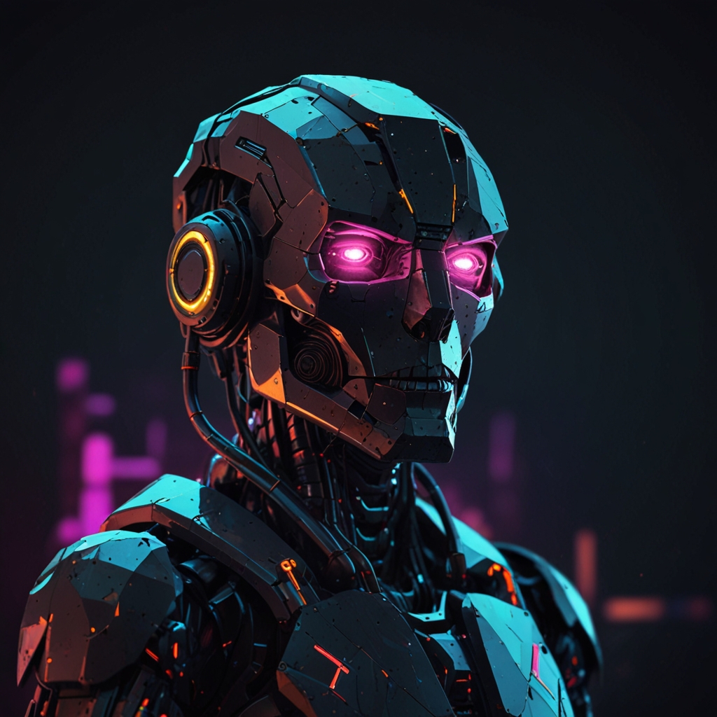 βThis image attempts a more fragmented, angular approach that hints at low-poly but feels more like a damaged/skeletal robot with a skull-like face, which is an interesting but inconsistent interpretation. The neon pink eyes and cyan tones against the dark background work well thematically, but the overall composition feels somewhat messy and the geometry lacks the clean low-poly faceting. Coherence suffers from the ambiguous anatomy and cluttered surface detailing.β