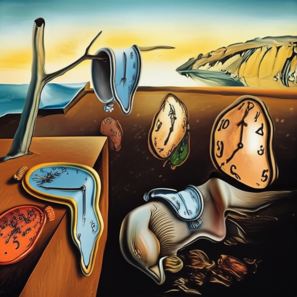 “Clearly inspired by Dalí's 'The Persistence of Memory,' this image captures the melting clock aesthetic with multiple drooping timepieces across a barren landscape. However, the execution feels derivative rather than original, and several elements — particularly the distorted objects in the foreground — lack clarity and appear anatomically ambiguous or incoherent. The muted color palette also contradicts the 'vibrant, psychedelic' requirement of the prompt, pulling down its overall score.”