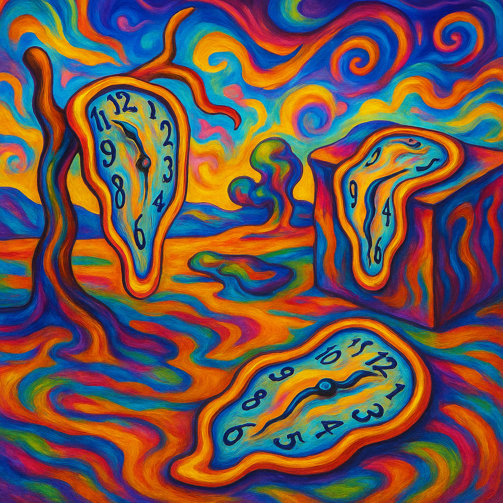βThis painting-style image excels at capturing the melting clock motif with genuine surrealist energy, featuring multiple distorted timepieces across a swirling, Van Gogh-meets-psychedelic landscape. The bold, saturated colors and expressive brushstroke texture create strong visual impact and artistic personality. Some clock number arrangements are distorted to the point of illegibility, which slightly hurts coherence, but overall this is the most faithful and creatively vibrant interpretation of the prompt.β